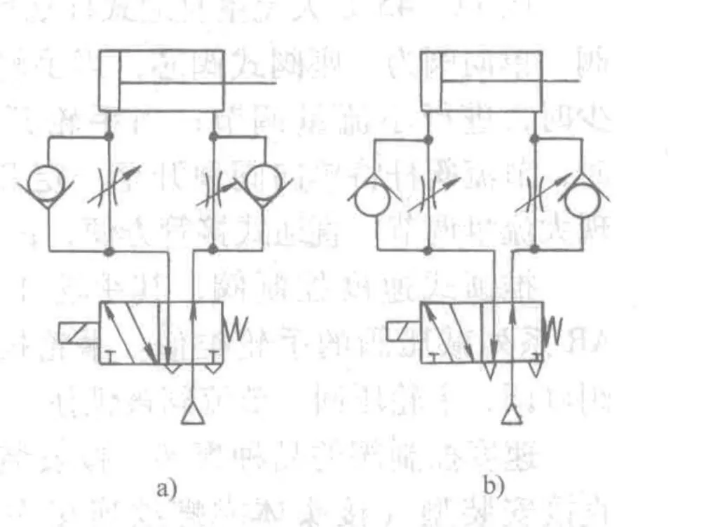 · In (a) (exhaust throttling), when the directional valve is energized, the check valve on the cylinder’s inlet side opens, allowing the rodless side to fill quickly. The air in the rod side can only exhaust through the throttle valve. By adjusting the throttle opening, the cylinder speed can be controlled. This method provides stable piston movement and is the most commonly used circuit.