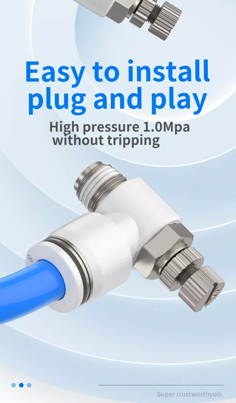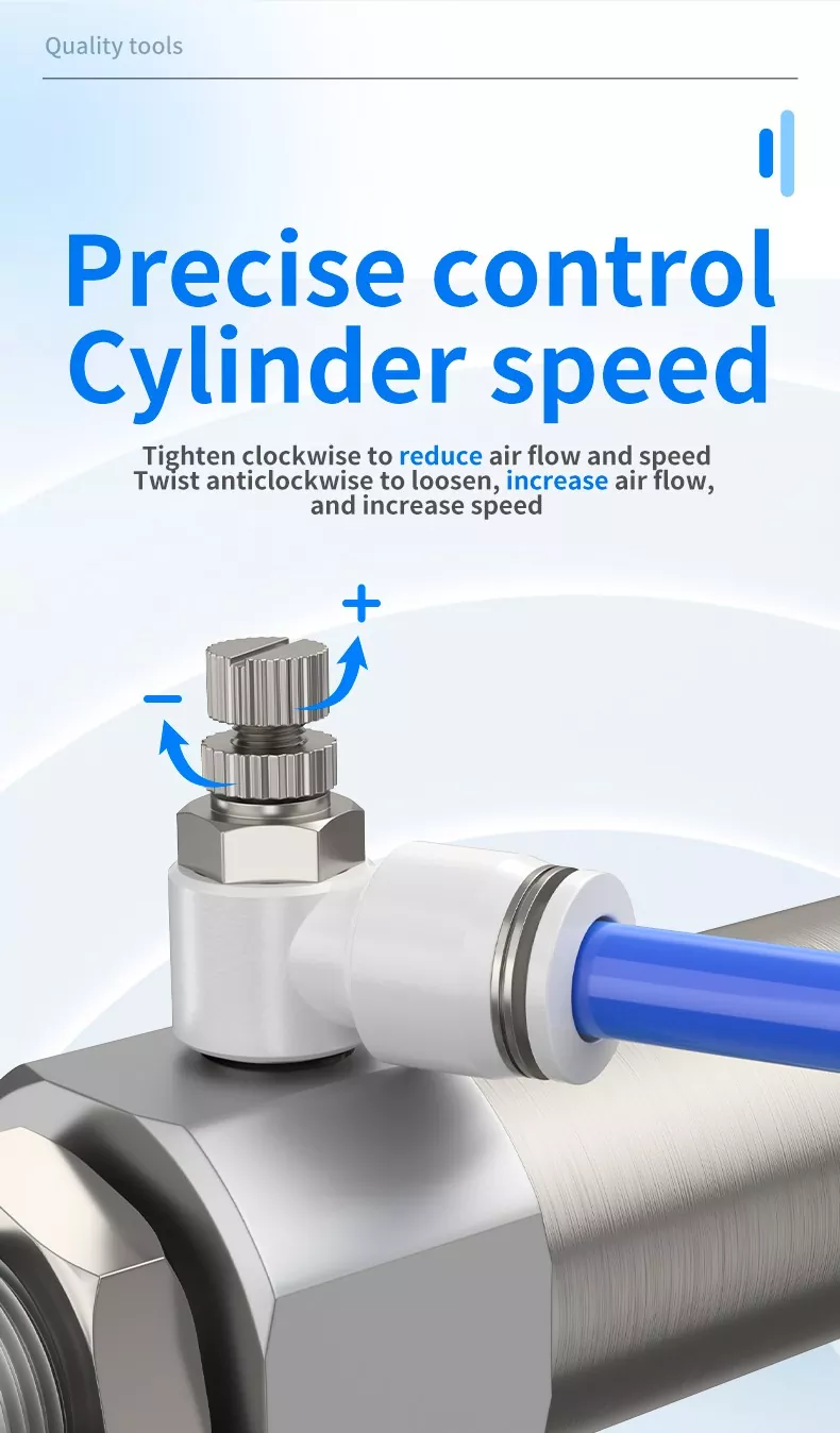 Speed controllers are common pneumatic components used to adjust the extension and retraction speed of actuators. Throttle valves are essentially flow-adjusting components that control cylinder speed, but their installation positions, throttling directions, and body designs differ. According to the control method, they can be divided into exhaust-throttling type and inlet-throttling type.