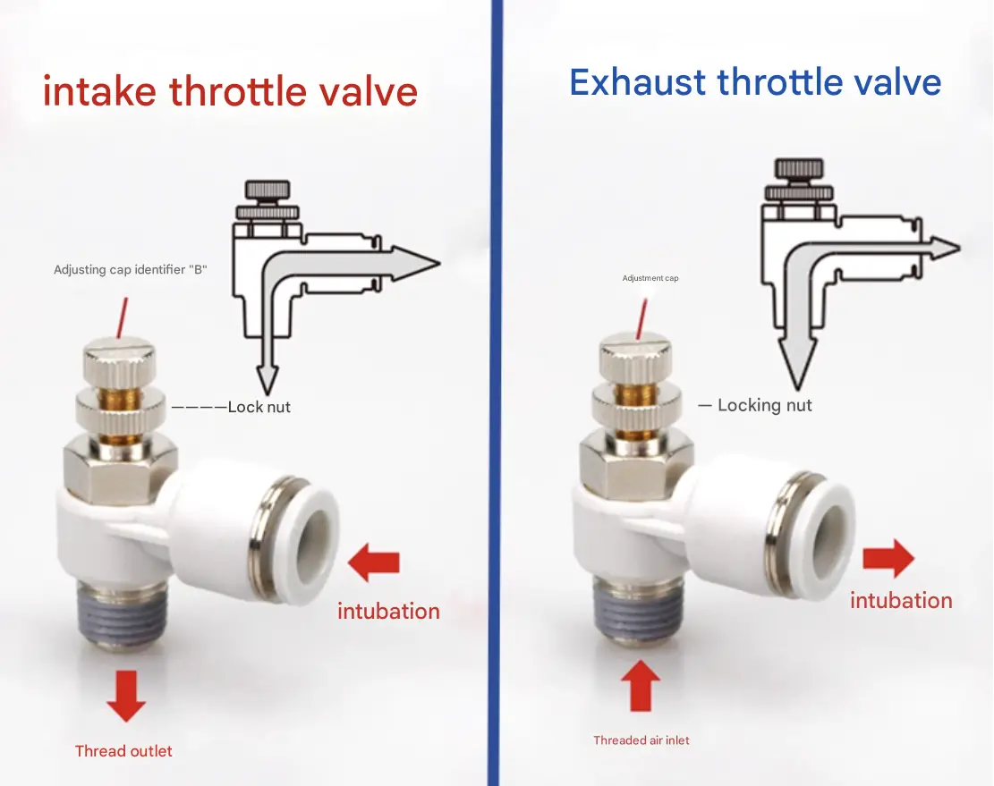 Inlet throttle valves take air in via tube and exhaust via threaded port; exhaust throttle valves take air in via threaded port and exhaust via tube.