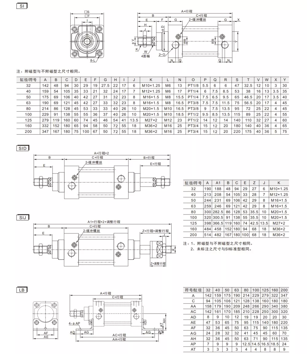 The SI series ISO15552 standard pneumatic cylinder are available in three types: standard double-acting, SID double-rod double-acting, and SIJ double-rod double-acting with adjustable stroke. They conform to the ISO 15552 standard, which means their installation dimensions are larger than SU pneumatic cylinders of the same size. Fixed accessories are not interchangeable and are only compatible with ISO 15552 (formerly ISO 6431) specifications.