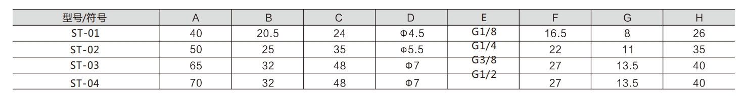 If the air tube fittings are not selected properly, causing the air intake or exhaust at a port to be very small, the valve core may not fully shift, leading to all ports being connected. This must be prevented. ST-01:G1/8 ; ST-02:G1/4 ; ST-03:G3/8 ; ST-04:G1/2