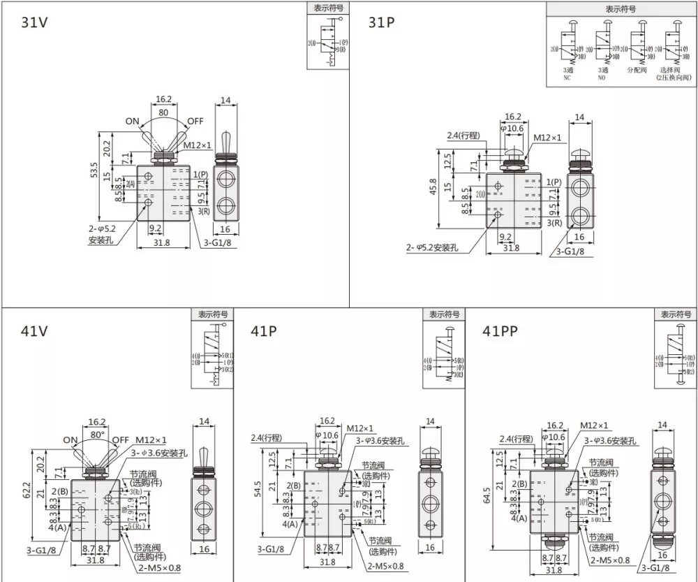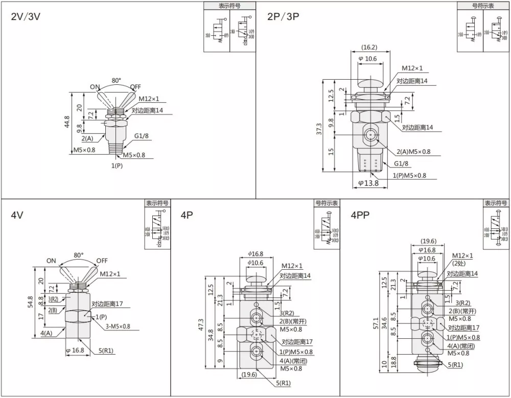 The TAC series toggle valve have 2 position 2 way , 2 position 3 way and 2 position 5 way can be chose.A various of lever type and two types thread :M5,G1/8.